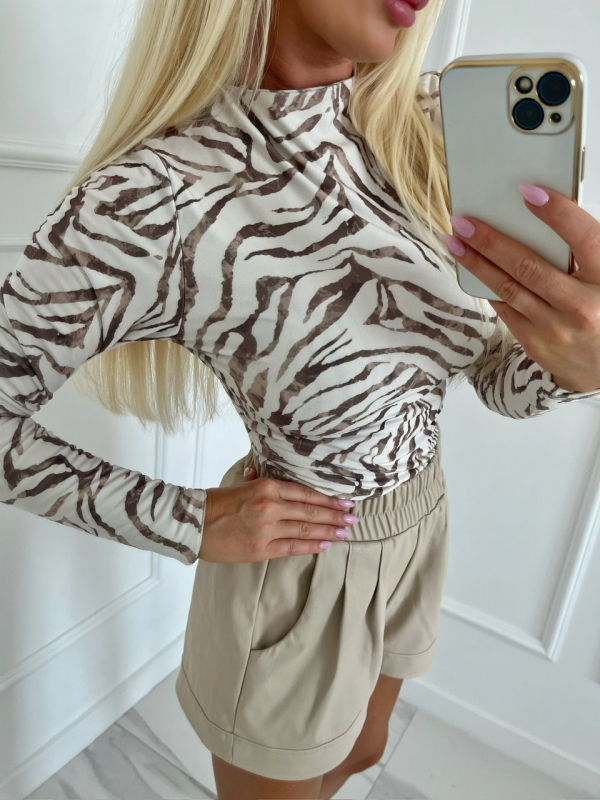 BaweÅ‚niana bluzeczka w oryginalny print. MateriaÅ‚ bardzo rozciÄ…gliwy. Delikatna, lekka, jesienna propozycja. Bluzka uszyta z podwójnego bardzo miÅ‚ego materiaÅ‚u. Åšwietnie sprawdzi siÄ™ do jesiennych stylizacji ze spódniczkÄ… jak i spodniami.