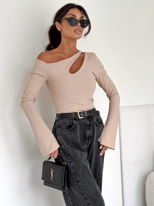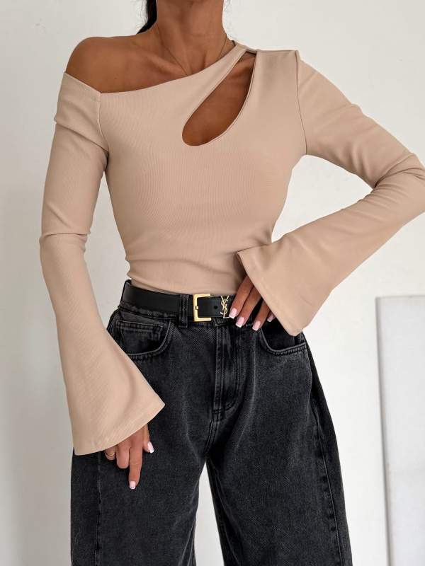 Bluzka bawełniana z bardzo modelującego materiału fitness. Piękne pęknięcia i delikatnie poszerzane rękawy.