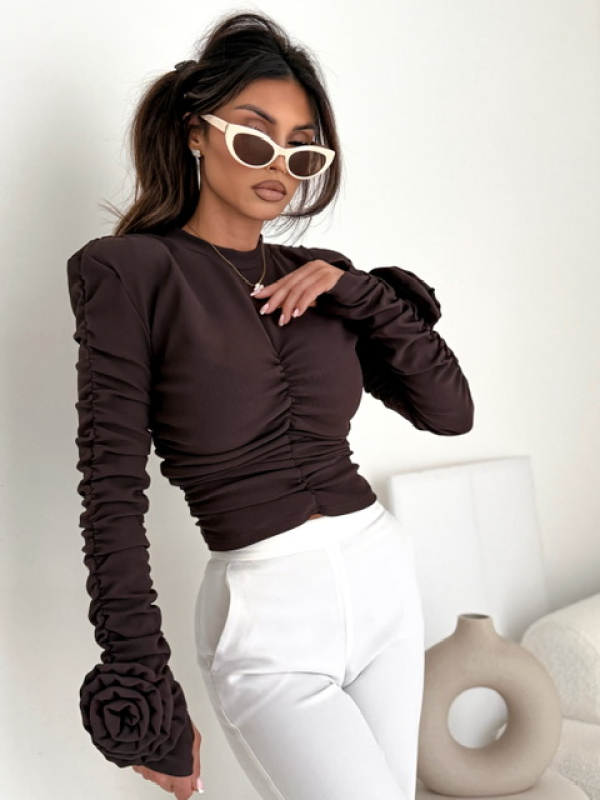 Bluzka bawełniana z bardzo modelującego materiału fitness. Pięknie marszczona z dwoma odpinanymi różyczkami.