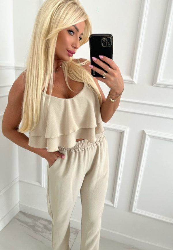 Piękny dwuczęściowy komplet w kolorze beżowym. Połączenie zwiewnej bluzeczki bez naramek i zwiewnych długich spodni. Bluzaczka ma falbanki i regulowane ramiączka. Spodnie mają gumę w pasie.